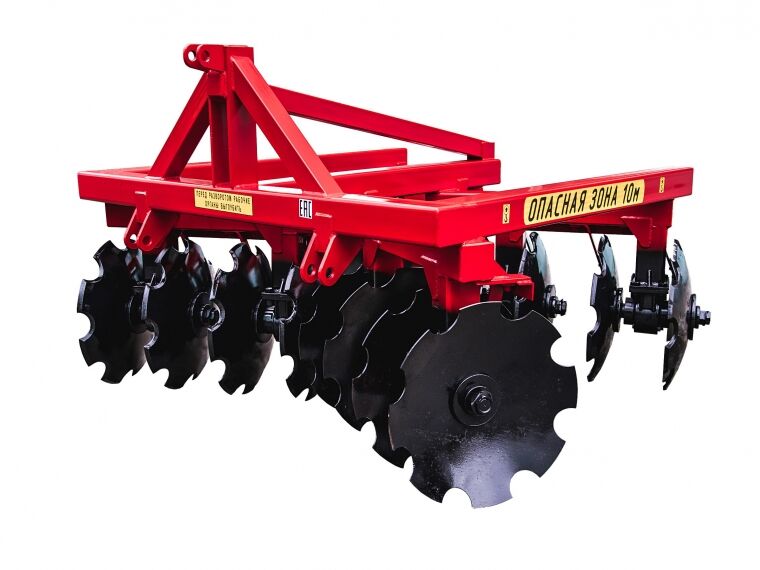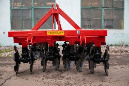Борона навесная дисковая тяжелая БНТ-2 предназначена для рыхления земель, засоренных древесными остатками толщиной до 2 см и мелкими камнями размером не более 10 см. Особенностью бороны являются сферические вырезные диски диаметром 650 мм, которые изготавливаются из высокоуглеродистой стали и собираются в 8 секций, по два диска на каждую секцию.