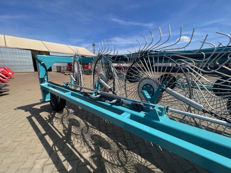 Зубья рабочих колес изготовлены из пружинной стали высокого качества диаметром 7 мм и имеют особую изогнутую форму, что позволяет им работать на изгиб и кручение сразу в двух плоскостях. При работе одновременно 4-5 зубьев постоянно контактируют с почвой, за счет чего обеспечивается качественный захват скошенной массы без попадания земли.