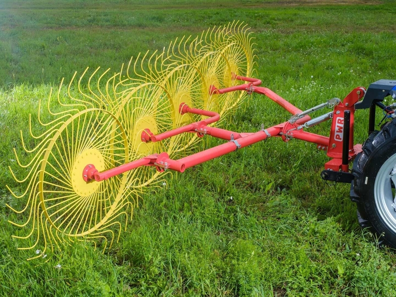 Грабли PWR 5 имеют широкую регулировку угла атаки и традиционно высокую конструктивную прочность. Грабли устанавливаются на заднюю навеску трактора, перевод машины из рабочего положения в транспортное и наоборот осуществляется оператором. Агрегатируются с тракторами тягового класса трактора от 0,6 тс. отечественного и импортного производства. Количество граблин в колесе 40 шт.