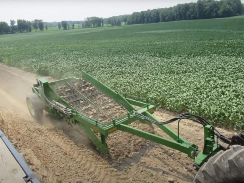 ✅ Комбайн картофелеуборочный двухрядный HANMA – предназначен для механизированного выкапывания картофеля, свеклы, моркови и других овощей при помощи трактора. Принцип работы копалки заключается в следующем: Привод транспортёра осуществляется за счет гидромотора. Ножи выкапывают по два ряда картофеля, глубина выкапывания 300 мм, общая ширина захвата двух ножей – 1400 мм. Выкопанные клубни попадают на транспортерную ленту, которая оснащена вибрирующем валом для отсеивания мелких фракции почвы и клубней. После транспортерной ленты клубни попадают на сборочный бункер объемом – 1500 л (1,5 куб. м.). Бункер за счет гидроцилиндров имеет возможность выгрузки назад.