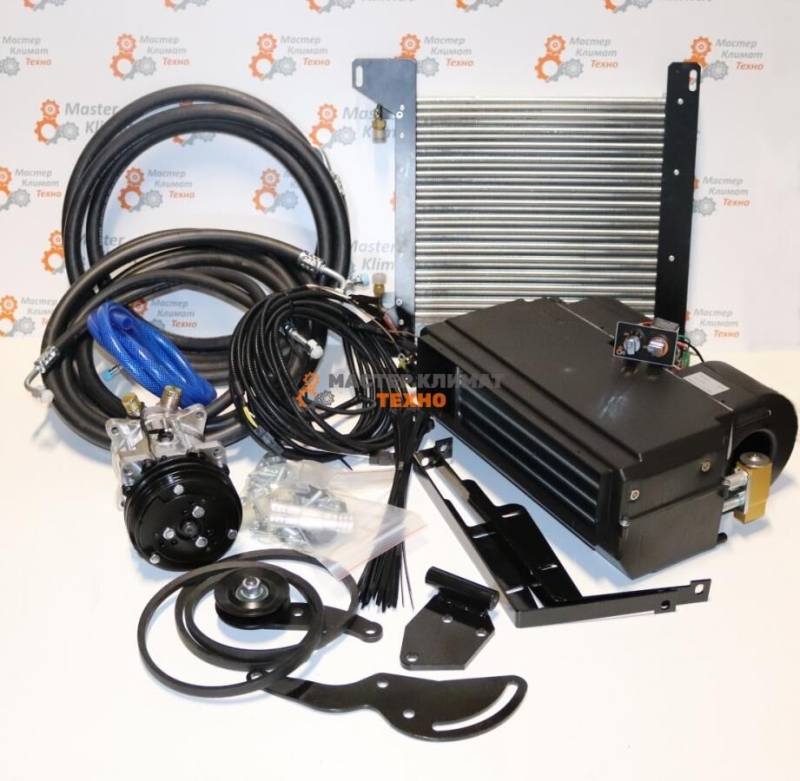 Комплект кондиционера подкапотный для линейки тракторов БЕЛАРУС МТЗ 1523, 1822 и их модификаций. Привод компрессора от двигателя трактора, конденсатор (радиатор кондиционера) устанавливается под капотом перед радиатором охлаждения, вместо штатного отопителя устанавливается испарительно-отопительный блок мощностью 6 кВт. Пульт управления оснащён электронным термостатом. Благодаря установке конденсатора под капотом высота трактора не увеличивается. Самая бюджетная модель из линейки кондиционеров для тракторов МТЗ.