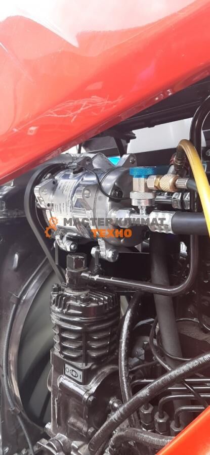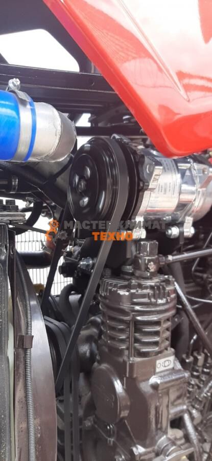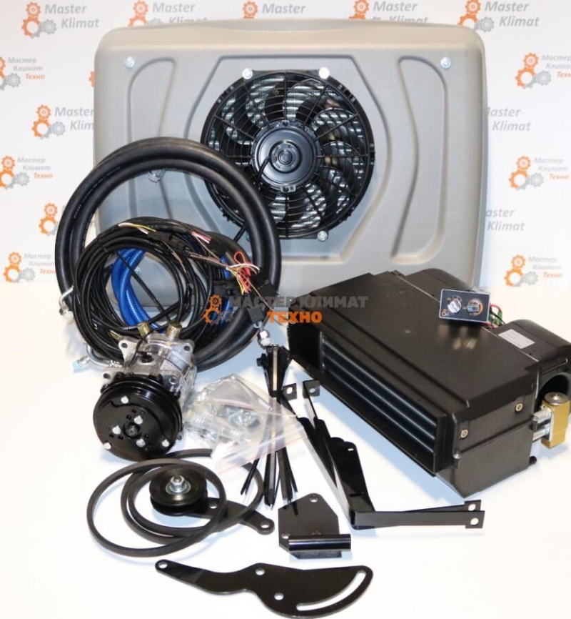Привод компрессора от двигателя трактора, конденсаторный блок устанавливается на крыше трактора, вместо штатного отопителя устанавливается испарительно-отопительный блок мощностью 6 кВт. Конденсаторный блок накрыт пластиковым кожухом и имеет собственный электрический вентилятор охлаждения размером 12”. Пульт управления оснащён электронным термостатом. Благодаря установке конденсатора на крыше трактора отпадает необходимость стравливания фреона при раскатке трактора.