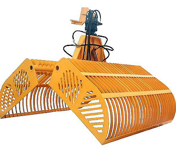 - Конструкция: Ковш состоит из двух подвижных челюстей, которые смыкаются с помощью гидравлических цилиндров для захвата материала.