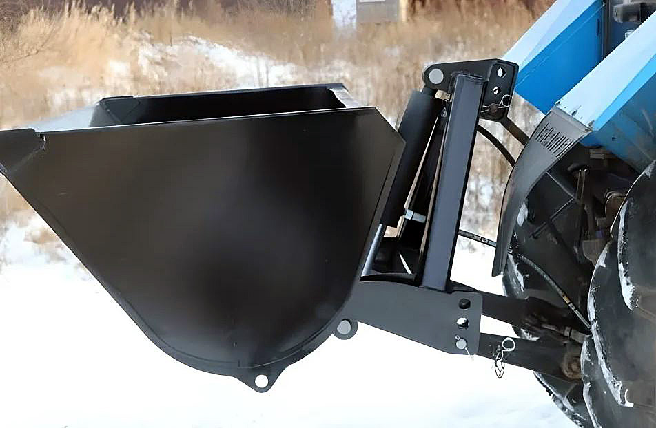 Ковш крепится на заднюю трехточку трактора и управляется гидроцилиндром, что позволяет плавно управлять ковшом, и выставлять необходимый угол при захвате насыпи и дальнейшей транспортировке.