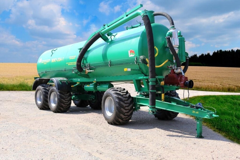 Машина для внесения жидких органических удобрений МЖУ-20А предназначена для самозагрузки, транспортирования и внесения жидких органических удобрений. Отличительным признаком новой машины является трёхосная ходовая система вместо двухосной с целью снижения давления на почву и снижения нагрузки на ТСУ трактора.