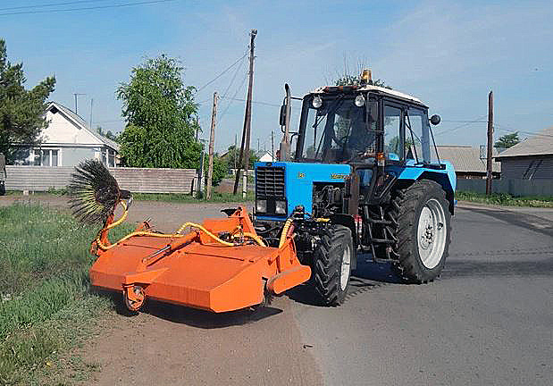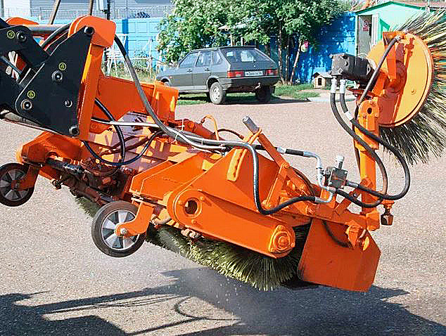 Привода для основной фронтальной щетки - гидравлический через доп. распределитель, для лотковой - так называемой "бордюрной щетки" так же используется гидравлический привод. Естественно нет необходимости установки дорогого гидравлического оборудования все работает на стандартной гидросистеме МТЗ.