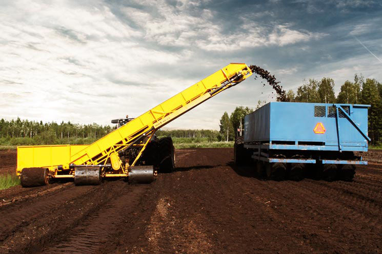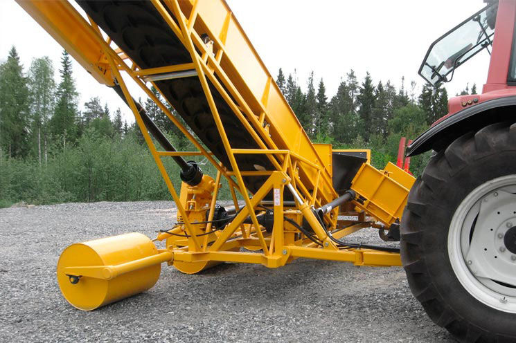 Захватными устройствами кусковой торф поднимается на конвейер трубчатого типа. где отсеивается мусор, потом поступает на поперечный просеивающий контейнер, переходит на ленточный, с него – в прицеп.