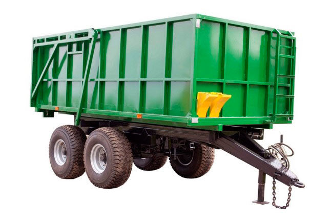 Самосвальный на три стороны, бортовой , двухосный. Фаркоп для второго прицепа. Нижние борта – две оси открывания против подсыпания. Задние борта съёмные под клапан на зелёнку.