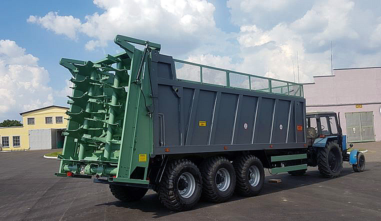 Прицеп-разбрасыватель оснащены рабочими органами с двумя вертикальными шнеками, обеспечивающими большую ширину разбрасывания и высокую производительность, с передним подвижным бортом.