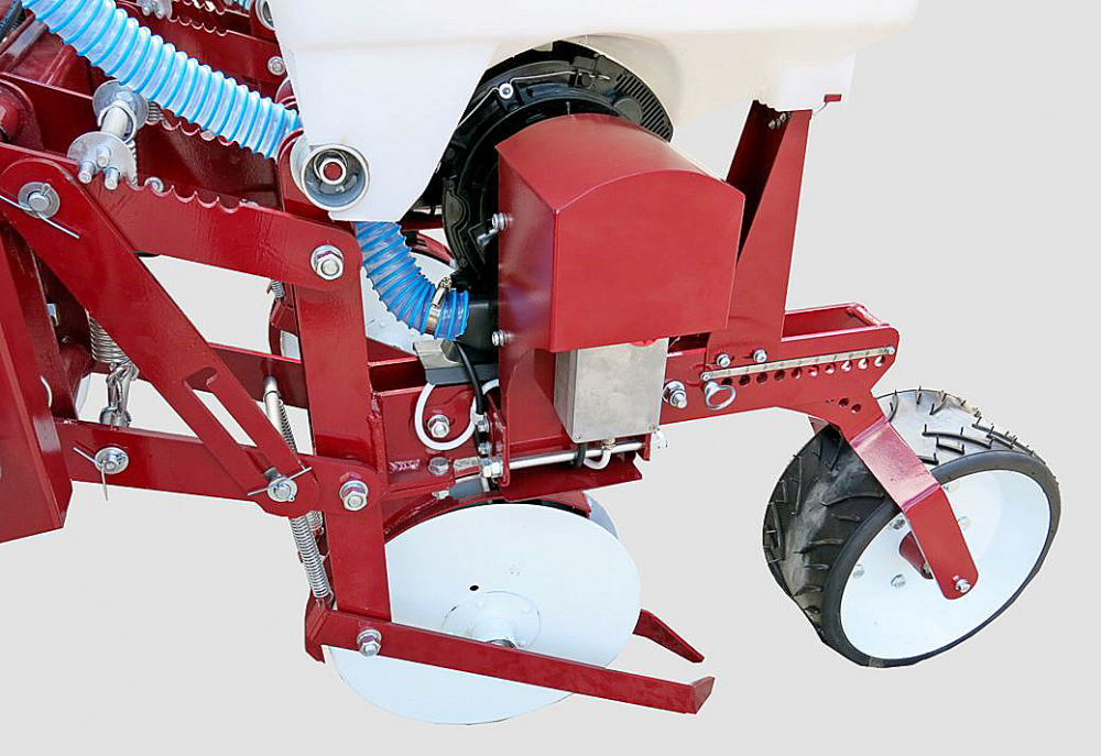 Двухдисковые сошники на параллелограммной подвеске копируют поверхность почвы и снабжены прикатывающими катками, одновременно выполняющими роль ограничителей глубины хода сошника.