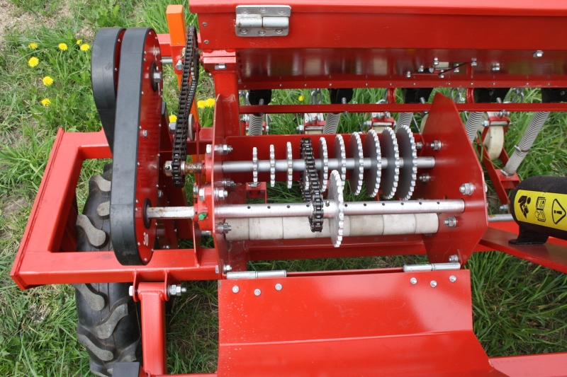 Предназначена для точного высеивания чистых семян на строчках или по всей ширине полосы без дополнительных средств. Применяется для различных сортов семян (диаметр до 8 мм). При помощи зубчатых и цепных передач и механизма регулировки глубины (силы прижима). Доступно 160 вариантов дозировки высеивания семян, которые